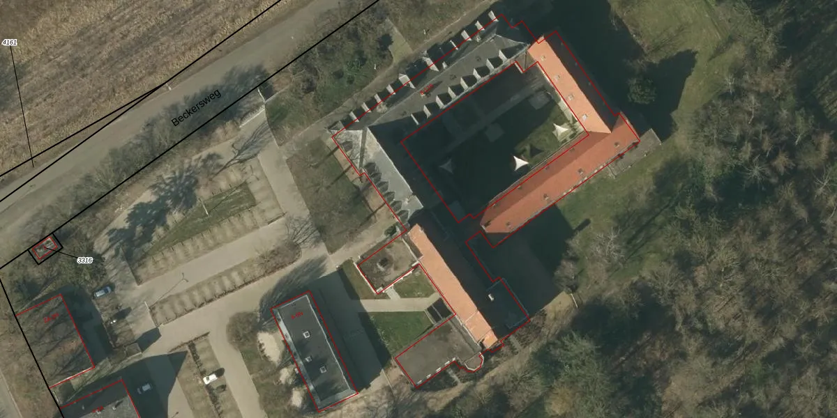 Het perceel waarop Beckersweg 8-A staat heeft een oppervlakte van 6,4 ha. Dit is een zeer groot perceel. De perceeloppervlakte wordt geregistreerd door het Kadaster. Gedetailleerde informatie over de maten van dit perceel kunt u vinden in het rapport Kadastrale kaart met maatvoering van Beckersweg 8-A.