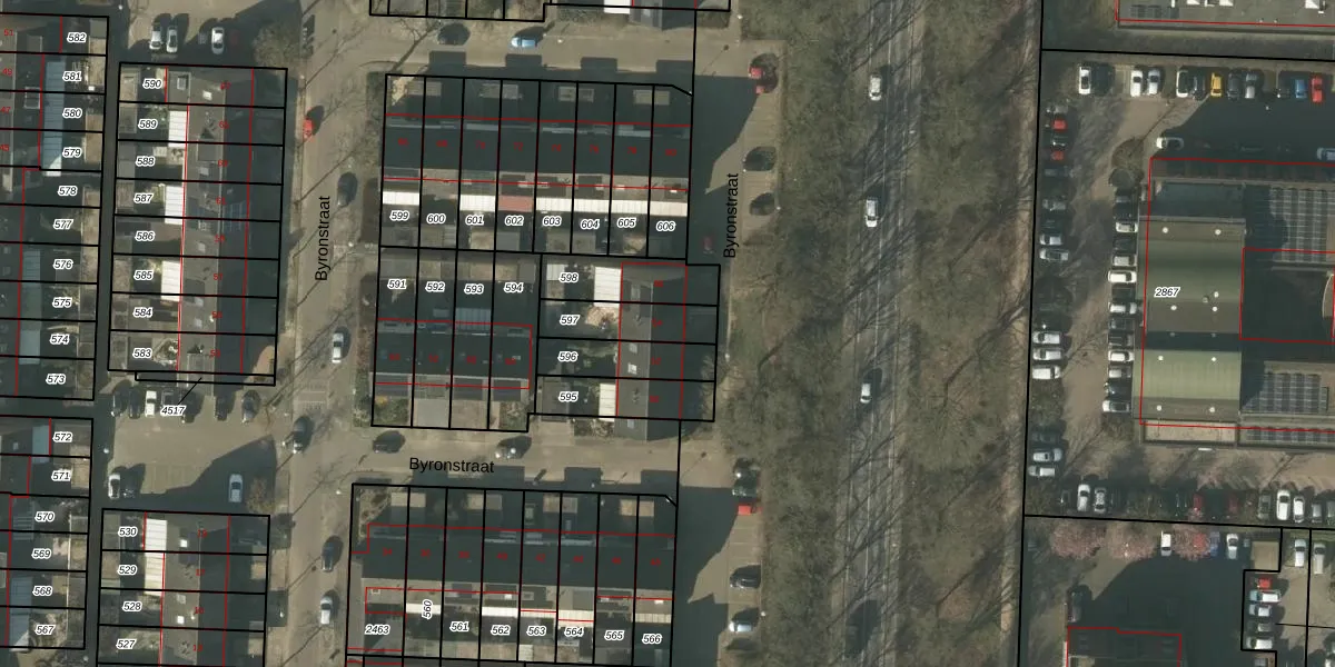 Byronstraat 54 is gelegen op kadastraal perceel VLO00N597. Deze kadastrale aanduiding is uniek en wordt gebruikt door het Kadaster om eigendomsrechten en andere zakelijke rechten vast te leggen. Het perceel maakt onderdeel uit van de kadastrale gemeente Venlo.