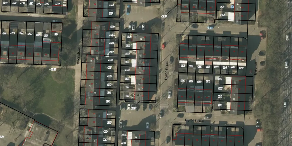 Het perceel waarop Byronstraat 59 staat heeft een oppervlakte van 142 m². Dit is een middelgroot perceel. De perceeloppervlakte wordt geregistreerd door het Kadaster. Gedetailleerde informatie over de maten van dit perceel kunt u vinden in het rapport Kadastrale kaart met maatvoering van Byronstraat 59.