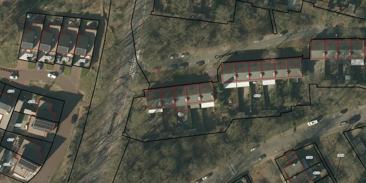 Het perceel waarop Casinoweg 52 staat heeft een oppervlakte van 3880 m². Dit is een zeer groot perceel. De perceeloppervlakte wordt geregistreerd door het Kadaster. Gedetailleerde informatie over de maten van dit perceel kunt u vinden in het rapport Kadastrale kaart met maatvoering van Casinoweg 52.