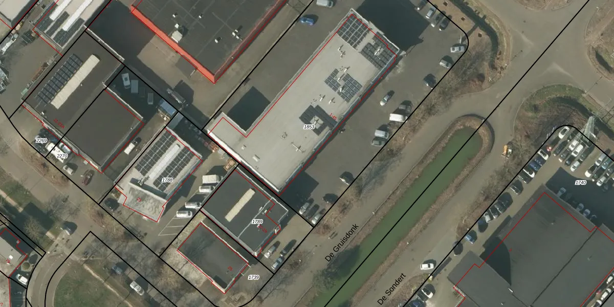Het perceel waarop De Gruisdonk 39 staat heeft een oppervlakte van 3885 m². Dit is een zeer groot perceel. De perceeloppervlakte wordt geregistreerd door het Kadaster. Gedetailleerde informatie over de maten van dit perceel kunt u vinden in het rapport Kadastrale kaart met maatvoering van De Gruisdonk 39.