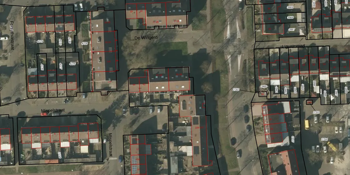Het perceel waarop De Wingerd 36 staat heeft een oppervlakte van 4510 m². Dit is een zeer groot perceel. De perceeloppervlakte wordt geregistreerd door het Kadaster. Gedetailleerde informatie over de maten van dit perceel kunt u vinden in het rapport Kadastrale kaart met maatvoering van De Wingerd 36.