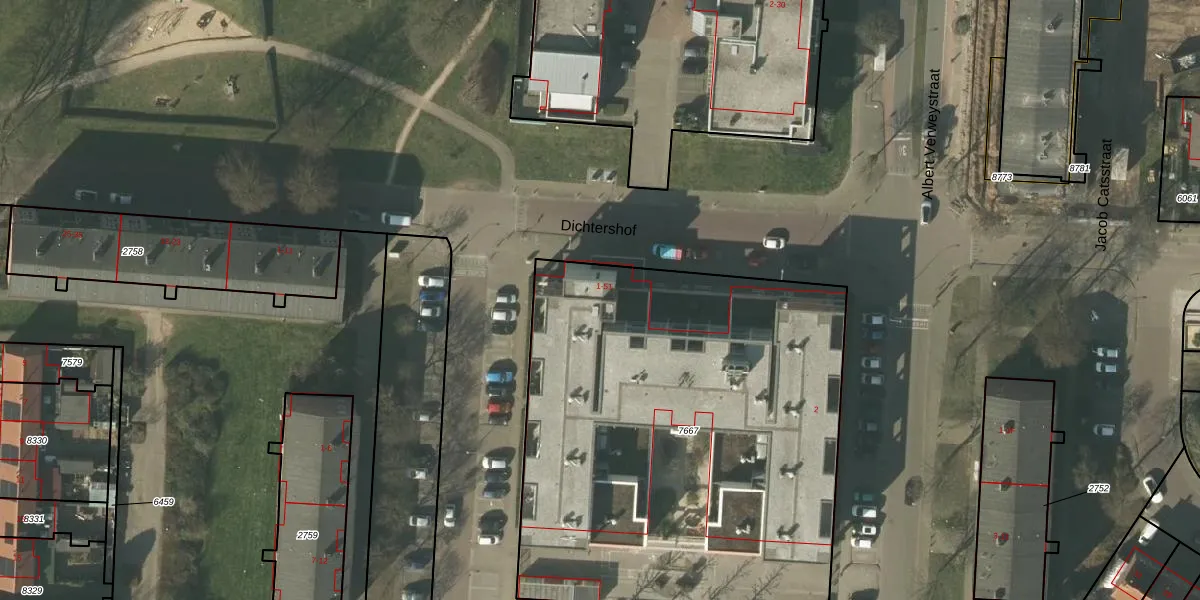 Dichtershof 25 is gelegen op kadastraal perceel VLO00M7667. Deze kadastrale aanduiding is uniek en wordt gebruikt door het Kadaster om eigendomsrechten en andere zakelijke rechten vast te leggen. Het perceel maakt onderdeel uit van de kadastrale gemeente Venlo.