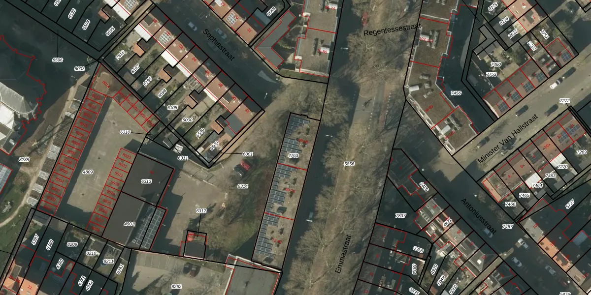 Het perceel waarop Emmastraat 50 staat heeft een oppervlakte van 550 m². Dit is een groot perceel. De perceeloppervlakte wordt geregistreerd door het Kadaster. Gedetailleerde informatie over de maten van dit perceel kunt u vinden in het rapport Kadastrale kaart met maatvoering van Emmastraat 50.
