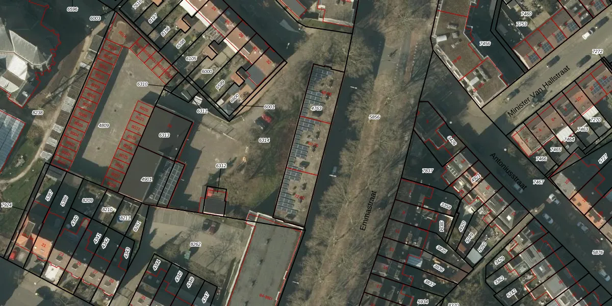 Het perceel waarop Emmastraat 64 staat heeft een oppervlakte van 550 m². Dit is een groot perceel. De perceeloppervlakte wordt geregistreerd door het Kadaster. Gedetailleerde informatie over de maten van dit perceel kunt u vinden in het rapport Kadastrale kaart met maatvoering van Emmastraat 64.