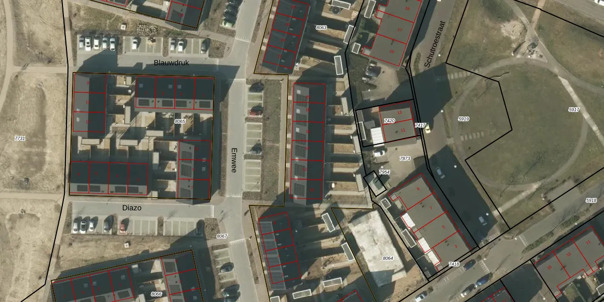 Het perceel waarop Emwee 14 staat heeft een oppervlakte van 3837 m². Dit is een zeer groot perceel. De perceeloppervlakte wordt geregistreerd door het Kadaster. Gedetailleerde informatie over de maten van dit perceel kunt u vinden in het rapport Kadastrale kaart met maatvoering van Emwee 14.
