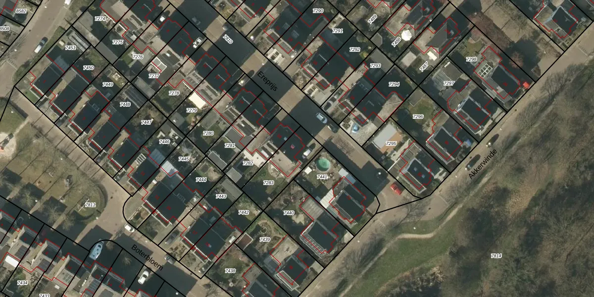 Het perceel waarop Ereprijs 20 staat heeft een oppervlakte van 310 m². Dit is een groot perceel. De perceeloppervlakte wordt geregistreerd door het Kadaster. Gedetailleerde informatie over de maten van dit perceel kunt u vinden in het rapport Kadastrale kaart met maatvoering van Ereprijs 20.