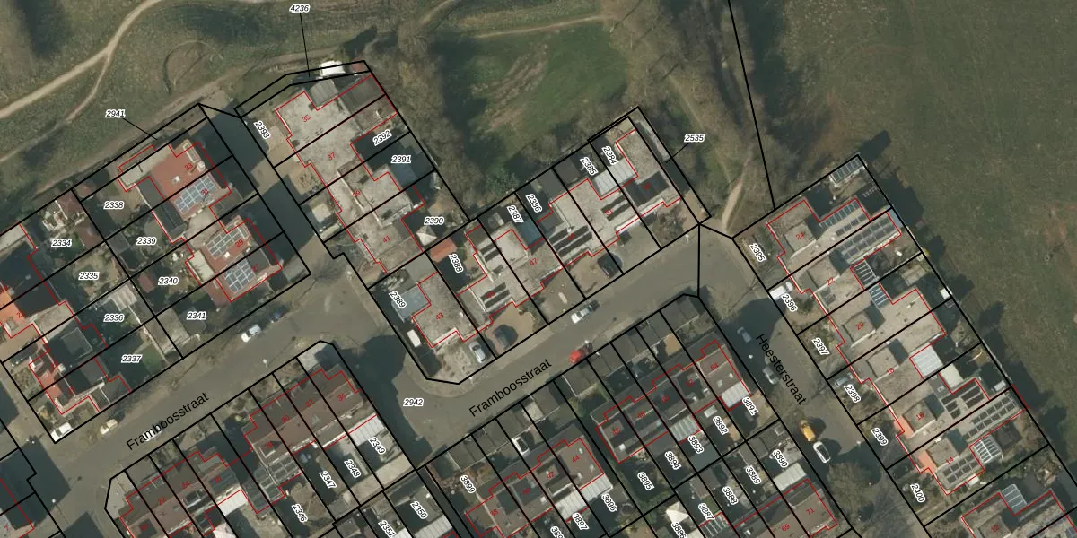Framboosstraat 47 is gelegen op kadastraal perceel VLO00N2387. Deze kadastrale aanduiding is uniek en wordt gebruikt door het Kadaster om eigendomsrechten en andere zakelijke rechten vast te leggen. Het perceel maakt onderdeel uit van de kadastrale gemeente Venlo.