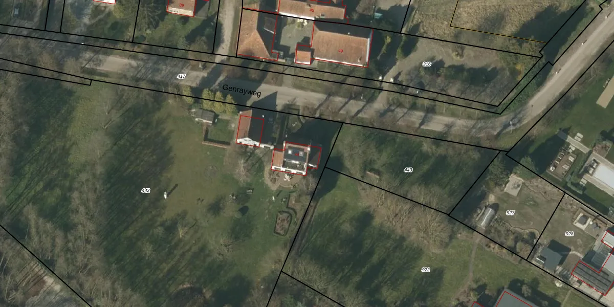 Het perceel waarop Genrayweg 44 staat heeft een oppervlakte van 7678 m². Dit is een zeer groot perceel. De perceeloppervlakte wordt geregistreerd door het Kadaster. Gedetailleerde informatie over de maten van dit perceel kunt u vinden in het rapport Kadastrale kaart met maatvoering van Genrayweg 44.