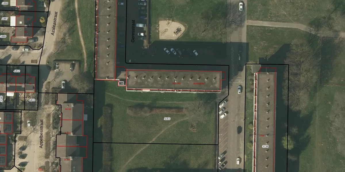 Het perceel waarop Geresstraat 251 staat heeft een oppervlakte van 7350 m². Dit is een zeer groot perceel. De perceeloppervlakte wordt geregistreerd door het Kadaster. Gedetailleerde informatie over de maten van dit perceel kunt u vinden in het rapport Kadastrale kaart met maatvoering van Geresstraat 251.