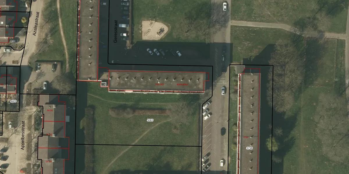 Het perceel waarop Geresstraat 257 staat heeft een oppervlakte van 7350 m². Dit is een zeer groot perceel. De perceeloppervlakte wordt geregistreerd door het Kadaster. Gedetailleerde informatie over de maten van dit perceel kunt u vinden in het rapport Kadastrale kaart met maatvoering van Geresstraat 257.