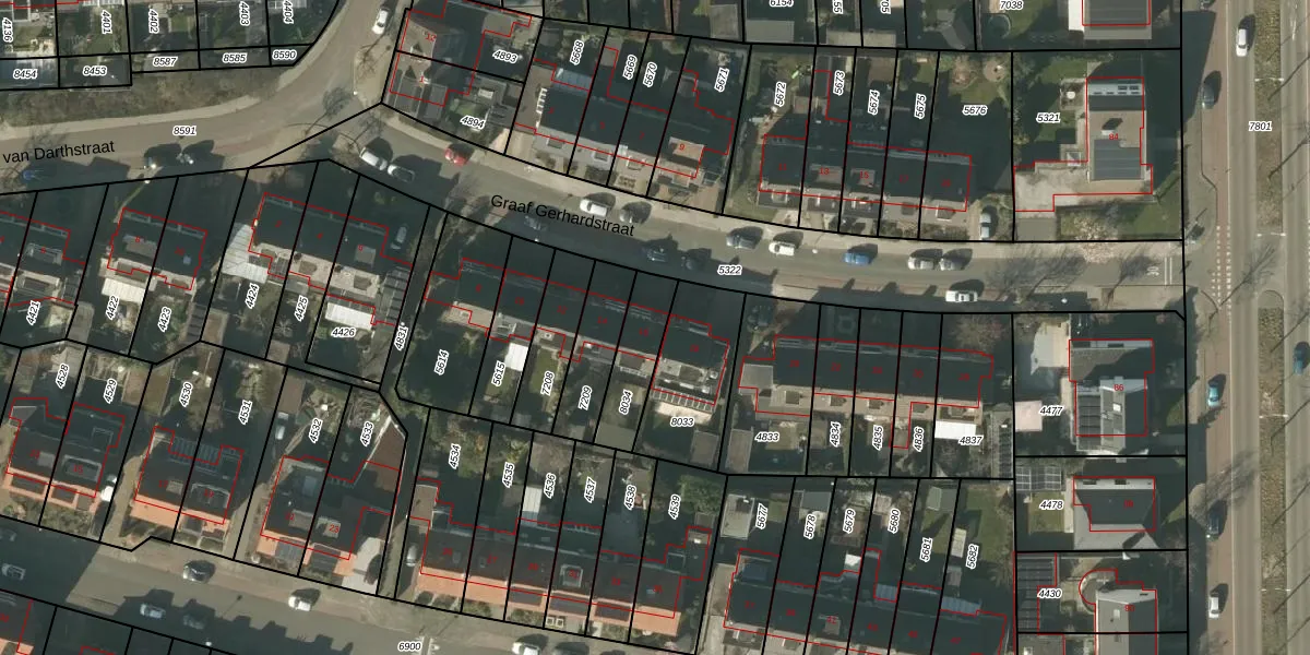 Het perceel waarop Graaf Gerhardstraat 16 staat heeft een oppervlakte van 176 m². Dit is een middelgroot perceel. De perceeloppervlakte wordt geregistreerd door het Kadaster. Gedetailleerde informatie over de maten van dit perceel kunt u vinden in het rapport Kadastrale kaart met maatvoering van Graaf Gerhardstraat 16.