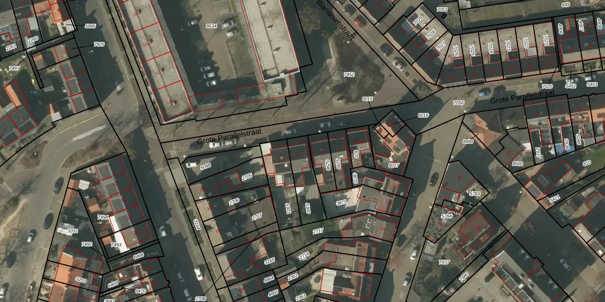 Grote Parallelstraat 25 is gelegen op kadastraal perceel VLO00M5300. Deze kadastrale aanduiding is uniek en wordt gebruikt door het Kadaster om eigendomsrechten en andere zakelijke rechten vast te leggen. Het perceel maakt onderdeel uit van de kadastrale gemeente Venlo.