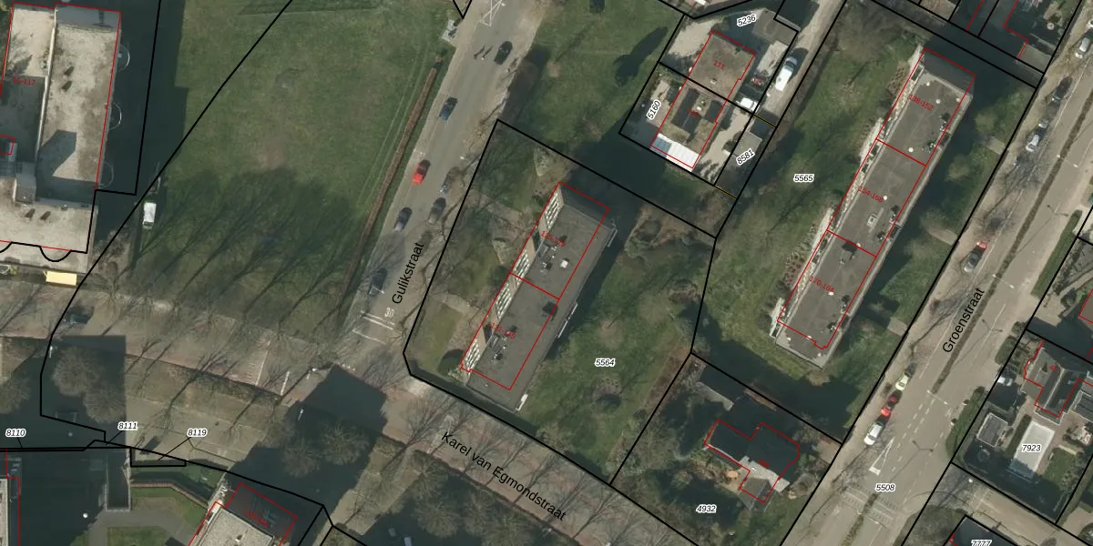 Het perceel waarop Gulikstraat 125 staat heeft een oppervlakte van 2280 m². Dit is een zeer groot perceel. De perceeloppervlakte wordt geregistreerd door het Kadaster. Gedetailleerde informatie over de maten van dit perceel kunt u vinden in het rapport Kadastrale kaart met maatvoering van Gulikstraat 125.