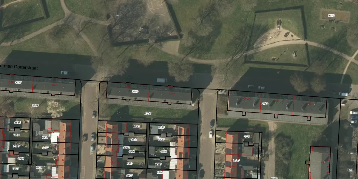 Het perceel waarop Herman Gorterstraat 39 staat heeft een oppervlakte van 437 m². Dit is een groot perceel. De perceeloppervlakte wordt geregistreerd door het Kadaster. Gedetailleerde informatie over de maten van dit perceel kunt u vinden in het rapport Kadastrale kaart met maatvoering van Herman Gorterstraat 39.