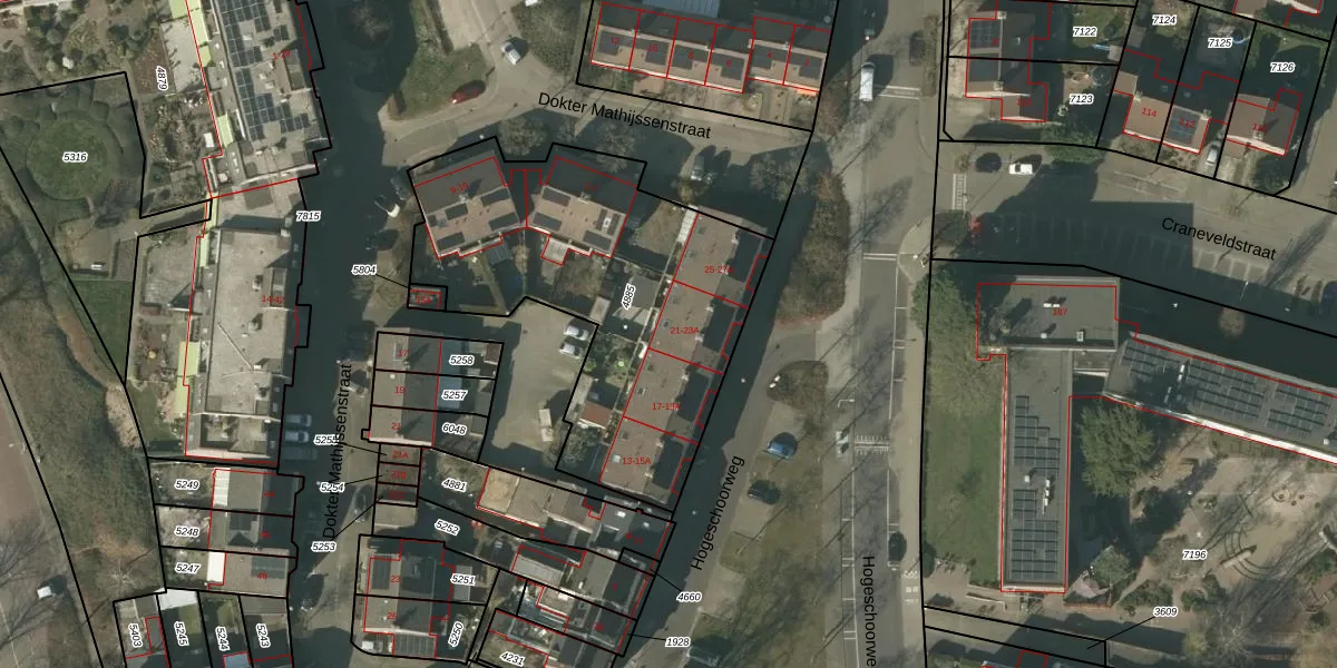 Hogeschoorweg 21 is gelegen op kadastraal perceel VLO00A4885. Deze kadastrale aanduiding is uniek en wordt gebruikt door het Kadaster om eigendomsrechten en andere zakelijke rechten vast te leggen. Het perceel maakt onderdeel uit van de kadastrale gemeente Venlo.