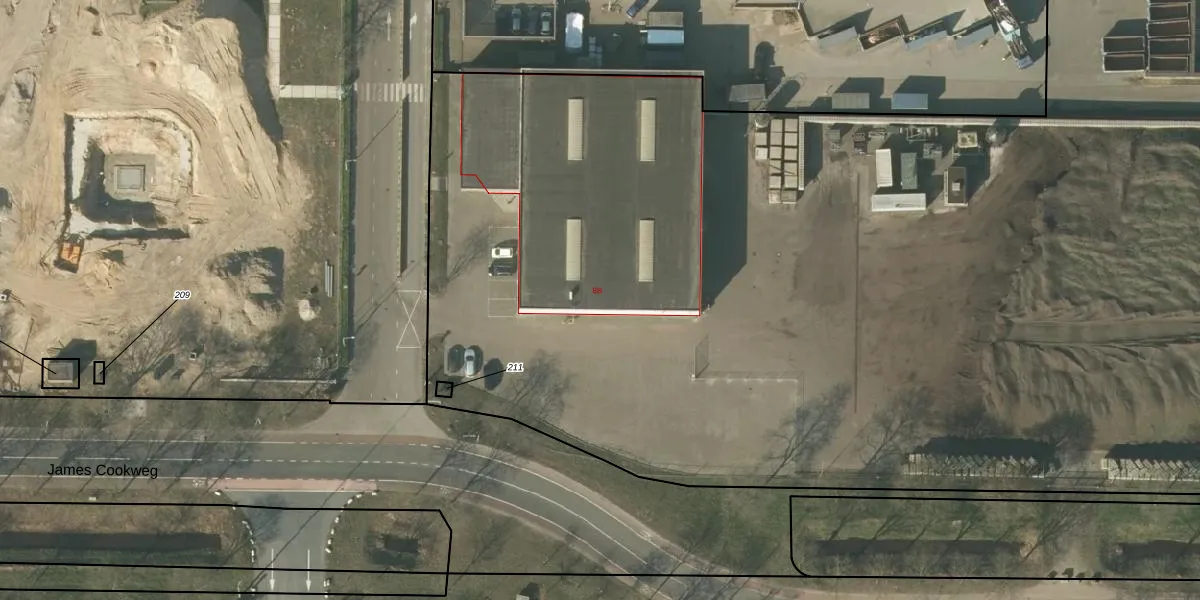 Het perceel waarop James Cookweg 8-B staat heeft een oppervlakte van 3,2 ha. Dit is een zeer groot perceel. De perceeloppervlakte wordt geregistreerd door het Kadaster. Gedetailleerde informatie over de maten van dit perceel kunt u vinden in het rapport Kadastrale kaart met maatvoering van James Cookweg 8-B.