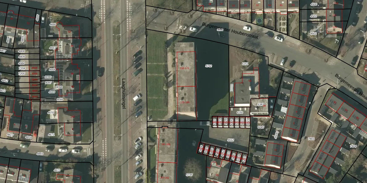 Laaghuissingel 185 is gelegen op kadastraal perceel VLO00D5732. Deze kadastrale aanduiding is uniek en wordt gebruikt door het Kadaster om eigendomsrechten en andere zakelijke rechten vast te leggen. Het perceel maakt onderdeel uit van de kadastrale gemeente Venlo.