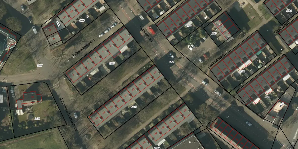 Leutherweg 114 is gelegen op kadastraal perceel VLO00F2246. Deze kadastrale aanduiding is uniek en wordt gebruikt door het Kadaster om eigendomsrechten en andere zakelijke rechten vast te leggen. Het perceel maakt onderdeel uit van de kadastrale gemeente Venlo.