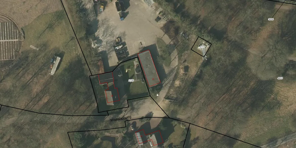 Het perceel waarop Maashofparklaan 14 staat heeft een oppervlakte van 5,0 ha. Dit is een zeer groot perceel. De perceeloppervlakte wordt geregistreerd door het Kadaster. Gedetailleerde informatie over de maten van dit perceel kunt u vinden in het rapport Kadastrale kaart met maatvoering van Maashofparklaan 14.