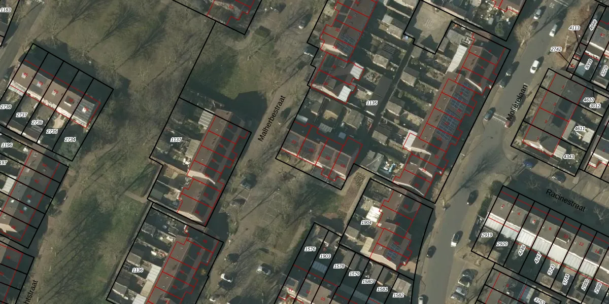 Het perceel waarop Malherbestraat 20 staat heeft een oppervlakte van 4870 m². Dit is een zeer groot perceel. De perceeloppervlakte wordt geregistreerd door het Kadaster. Gedetailleerde informatie over de maten van dit perceel kunt u vinden in het rapport Kadastrale kaart met maatvoering van Malherbestraat 20.
