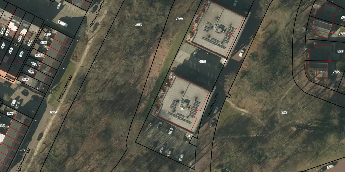 Het perceel waarop het adres ligt is VLO00-F-4202. De afkorting 'VLO00' staat voor kadastrale gemeente Venlo. De oppervlakte van het perceel is 3385 m². Dat is groter dan gemiddeld in Venlo, waar de gemiddelde perceeloppervlakte op 1971,12 m² ligt. Het grootste perceel in de kadastrale gemeente is 82,6 ha. Het kleinste perceel heeft een oppervlakte van 0 m². Op het perceel zijn 42 adressen aanwezig. De huidige grenzen van het perceel zijn digitaal in de Basisregistratie Kadaster (BRK) geregistreerd op 06-05-2022.
