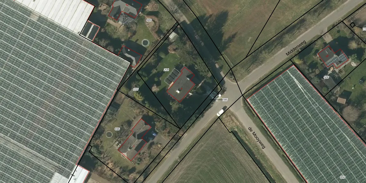 Middenweg 9 is gelegen op kadastraal perceel VLO00U204. Deze kadastrale aanduiding is uniek en wordt gebruikt door het Kadaster om eigendomsrechten en andere zakelijke rechten vast te leggen. Het perceel maakt onderdeel uit van de kadastrale gemeente Venlo.