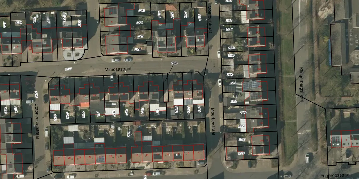 Mimosastraat 5 is gelegen op kadastraal perceel VLO00N2182. Deze kadastrale aanduiding is uniek en wordt gebruikt door het Kadaster om eigendomsrechten en andere zakelijke rechten vast te leggen. Het perceel maakt onderdeel uit van de kadastrale gemeente Venlo.