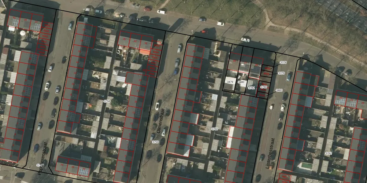 Het perceel waarop Olmenstraat 12 staat heeft een oppervlakte van 3708 m². Dit is een zeer groot perceel. De perceeloppervlakte wordt geregistreerd door het Kadaster. Gedetailleerde informatie over de maten van dit perceel kunt u vinden in het rapport Kadastrale kaart met maatvoering van Olmenstraat 12.
