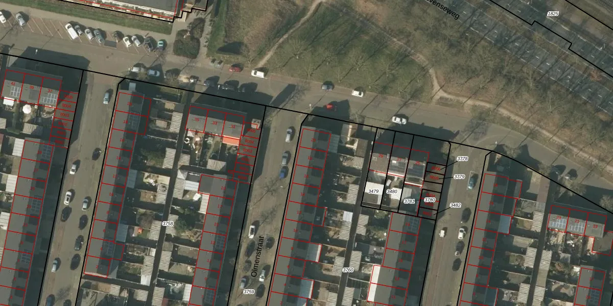 Het perceel waarop Olmenstraat 18 staat heeft een oppervlakte van 3708 m². Dit is een zeer groot perceel. De perceeloppervlakte wordt geregistreerd door het Kadaster. Gedetailleerde informatie over de maten van dit perceel kunt u vinden in het rapport Kadastrale kaart met maatvoering van Olmenstraat 18.