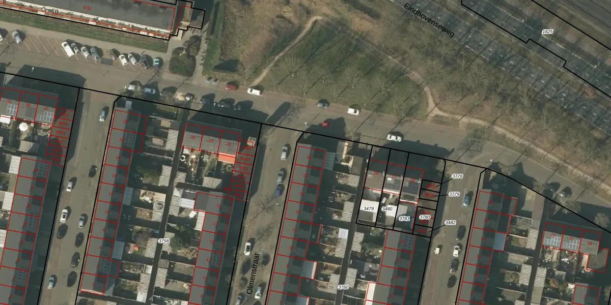 Het perceel waarop Olmenstraat 20 staat heeft een oppervlakte van 3708 m². Dit is een zeer groot perceel. De perceeloppervlakte wordt geregistreerd door het Kadaster. Gedetailleerde informatie over de maten van dit perceel kunt u vinden in het rapport Kadastrale kaart met maatvoering van Olmenstraat 20.