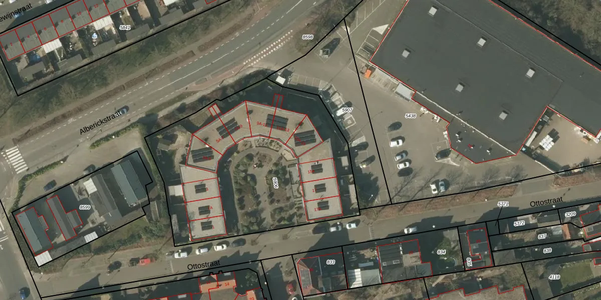 Ottostraat 15 is gelegen op kadastraal perceel VLO00M5906. Deze kadastrale aanduiding is uniek en wordt gebruikt door het Kadaster om eigendomsrechten en andere zakelijke rechten vast te leggen. Het perceel maakt onderdeel uit van de kadastrale gemeente Venlo.