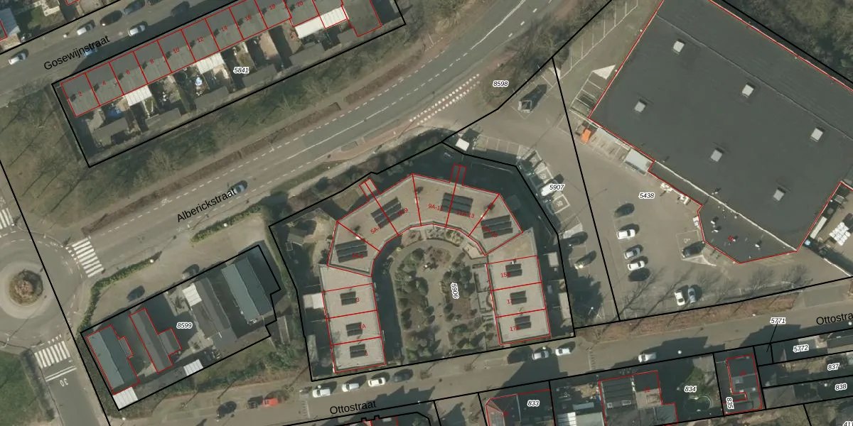 Ottostraat 9-A is gelegen op kadastraal perceel VLO00M5906. Deze kadastrale aanduiding is uniek en wordt gebruikt door het Kadaster om eigendomsrechten en andere zakelijke rechten vast te leggen. Het perceel maakt onderdeel uit van de kadastrale gemeente Venlo.