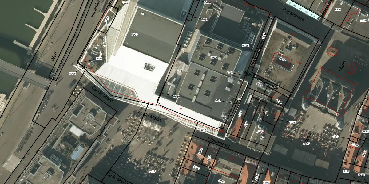 Het perceel waarop Oude Markt 30 staat heeft een oppervlakte van 2709 m². Dit is een zeer groot perceel. De perceeloppervlakte wordt geregistreerd door het Kadaster. Gedetailleerde informatie over de maten van dit perceel kunt u vinden in het rapport Kadastrale kaart met maatvoering van Oude Markt 30.