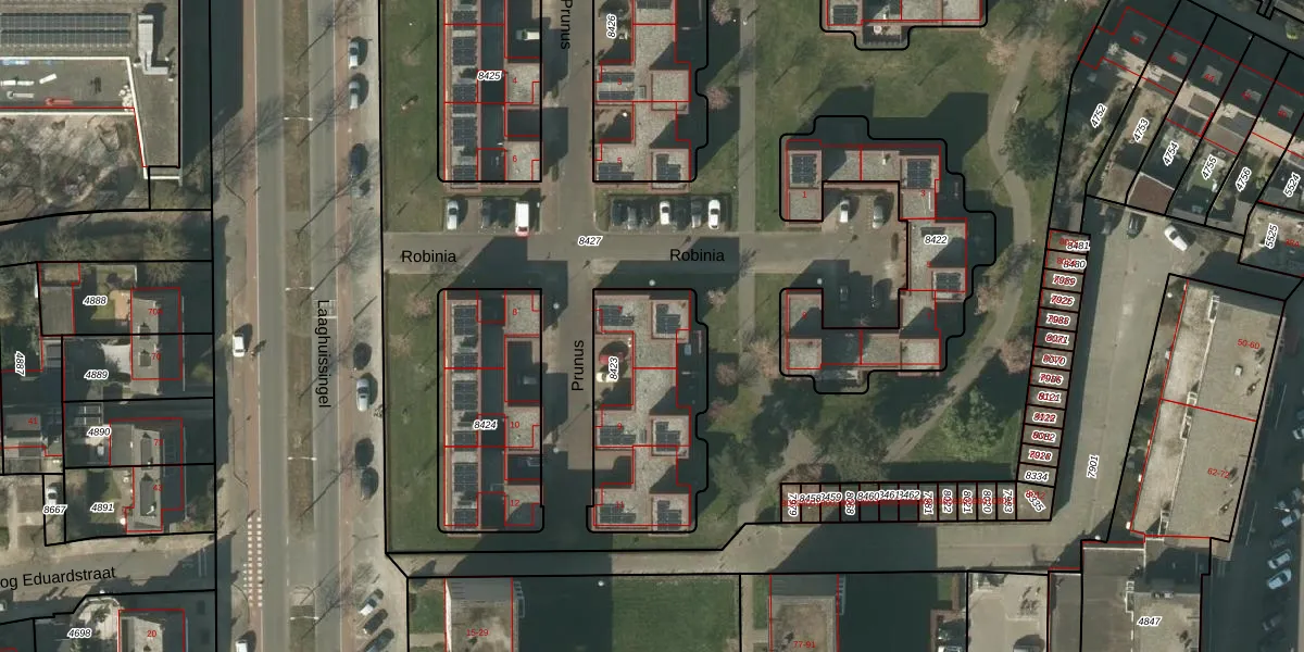 Prunus 7 is gelegen op kadastraal perceel VLO00D8423. Deze kadastrale aanduiding is uniek en wordt gebruikt door het Kadaster om eigendomsrechten en andere zakelijke rechten vast te leggen. Het perceel maakt onderdeel uit van de kadastrale gemeente Venlo.