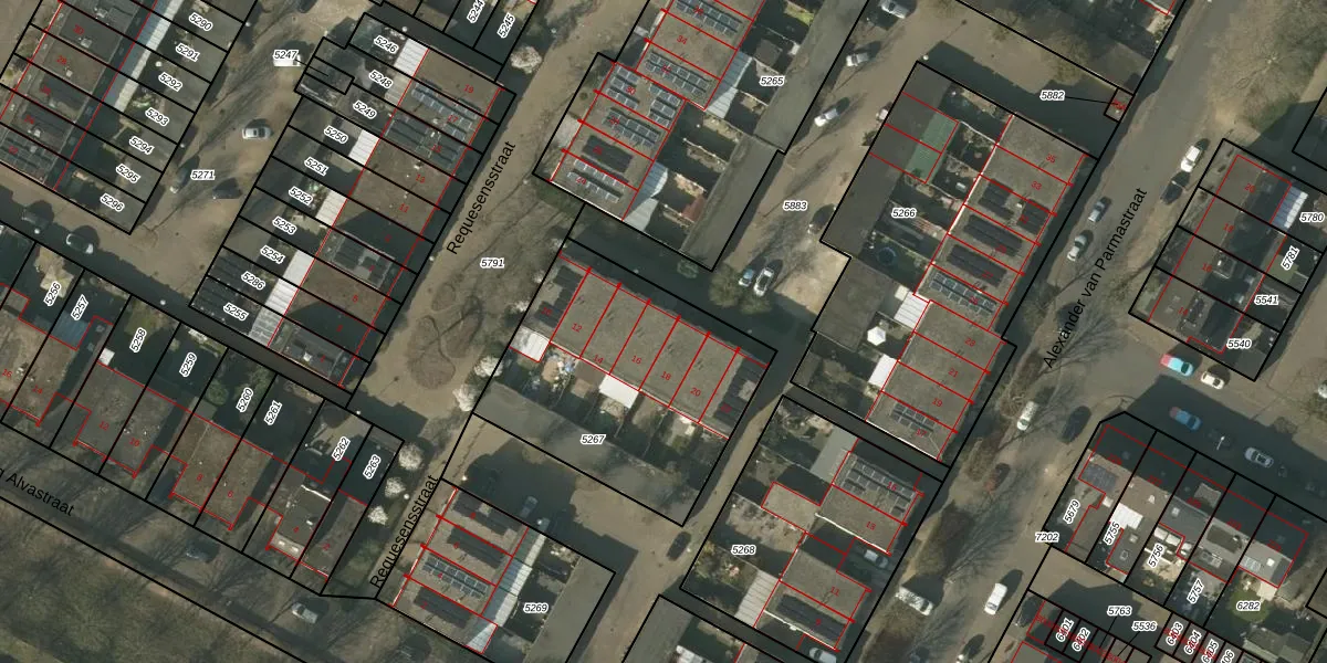 Requesensstraat 16 is gelegen op kadastraal perceel VLO00L5267. Deze kadastrale aanduiding is uniek en wordt gebruikt door het Kadaster om eigendomsrechten en andere zakelijke rechten vast te leggen. Het perceel maakt onderdeel uit van de kadastrale gemeente Venlo.