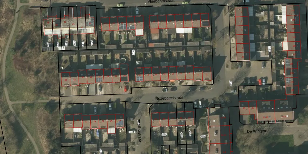 Het perceel waarop Rozebottelstraat 14 staat heeft een oppervlakte van 4742 m². Dit is een zeer groot perceel. De perceeloppervlakte wordt geregistreerd door het Kadaster. Gedetailleerde informatie over de maten van dit perceel kunt u vinden in het rapport Kadastrale kaart met maatvoering van Rozebottelstraat 14.