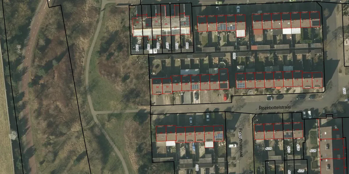 Het perceel waarop Rozebottelstraat 30 staat heeft een oppervlakte van 4742 m². Dit is een zeer groot perceel. De perceeloppervlakte wordt geregistreerd door het Kadaster. Gedetailleerde informatie over de maten van dit perceel kunt u vinden in het rapport Kadastrale kaart met maatvoering van Rozebottelstraat 30.