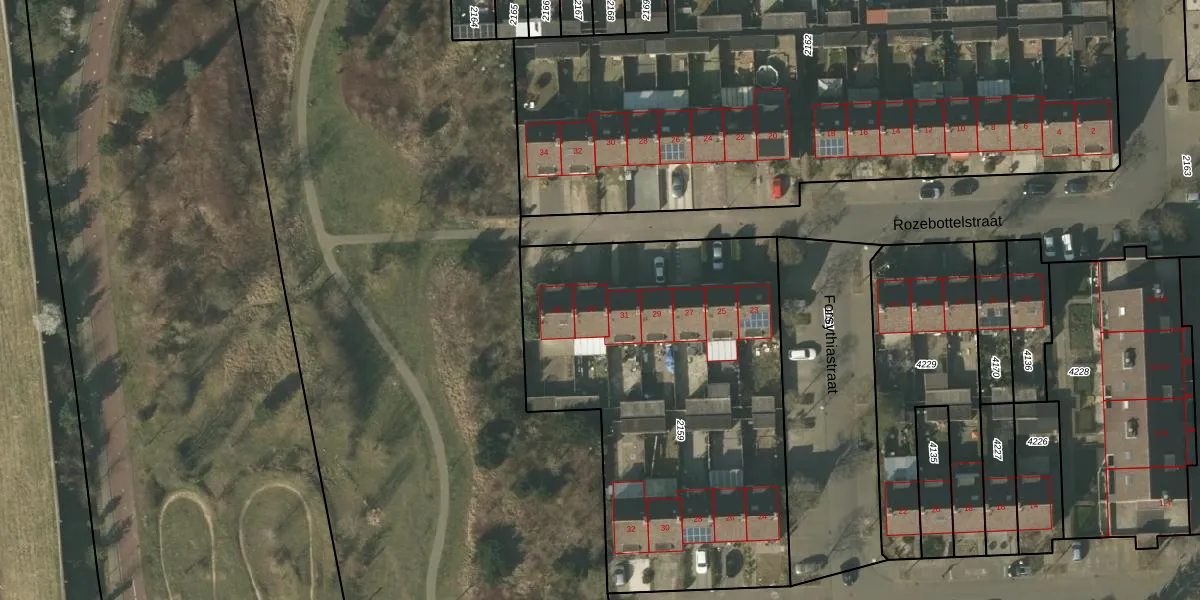 Het perceel waarop Rozebottelstraat 33 staat heeft een oppervlakte van 2119 m². Dit is een zeer groot perceel. De perceeloppervlakte wordt geregistreerd door het Kadaster. Gedetailleerde informatie over de maten van dit perceel kunt u vinden in het rapport Kadastrale kaart met maatvoering van Rozebottelstraat 33.