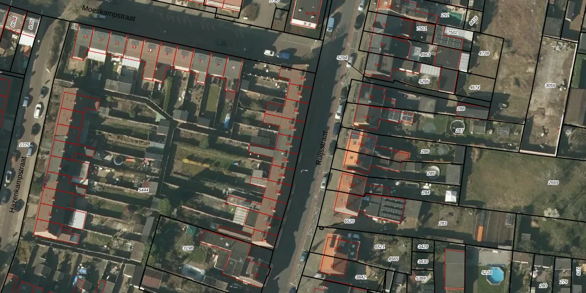 Het perceel waarop Ruijsstraat 102 staat heeft een oppervlakte van 7768 m². Dit is een zeer groot perceel. De perceeloppervlakte wordt geregistreerd door het Kadaster. Gedetailleerde informatie over de maten van dit perceel kunt u vinden in het rapport Kadastrale kaart met maatvoering van Ruijsstraat 102.
