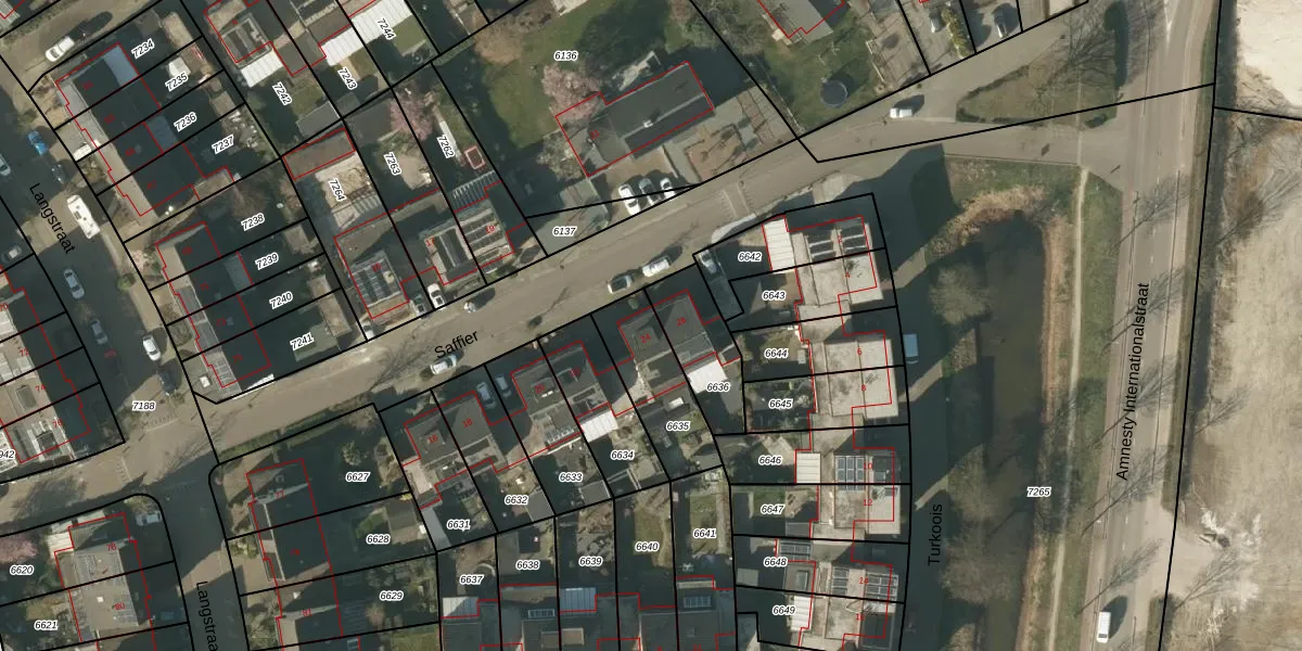 Het perceel waarop Saffier 24 staat heeft een oppervlakte van 263 m². Dit is een middelgroot perceel. De perceeloppervlakte wordt geregistreerd door het Kadaster. Gedetailleerde informatie over de maten van dit perceel kunt u vinden in het rapport Kadastrale kaart met maatvoering van Saffier 24.