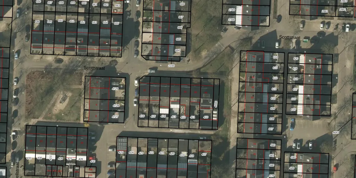 Scottstraat 34 is gelegen op kadastraal perceel VLO00N413. Deze kadastrale aanduiding is uniek en wordt gebruikt door het Kadaster om eigendomsrechten en andere zakelijke rechten vast te leggen. Het perceel maakt onderdeel uit van de kadastrale gemeente Venlo.