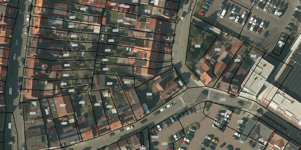 Steegstraat 56 is gelegen op kadastraal perceel VLO00M5538. Deze kadastrale aanduiding is uniek en wordt gebruikt door het Kadaster om eigendomsrechten en andere zakelijke rechten vast te leggen. Het perceel maakt onderdeel uit van de kadastrale gemeente Venlo.