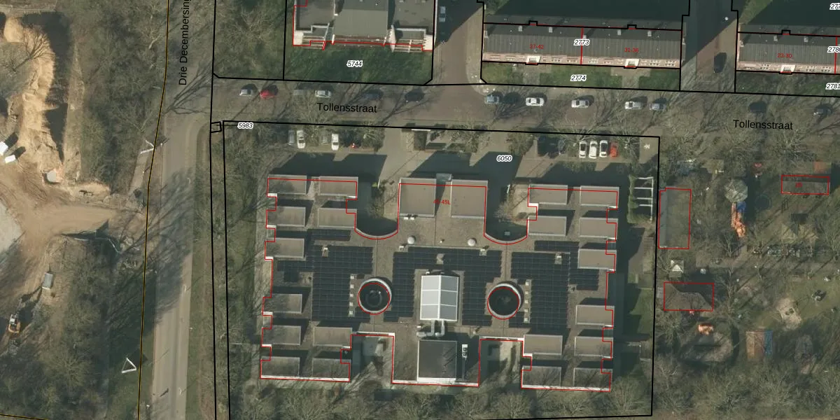 Het perceel waarop Tollensstraat 45 staat heeft een oppervlakte van 7114 m². Dit is een zeer groot perceel. De perceeloppervlakte wordt geregistreerd door het Kadaster. Gedetailleerde informatie over de maten van dit perceel kunt u vinden in het rapport Kadastrale kaart met maatvoering van Tollensstraat 45.