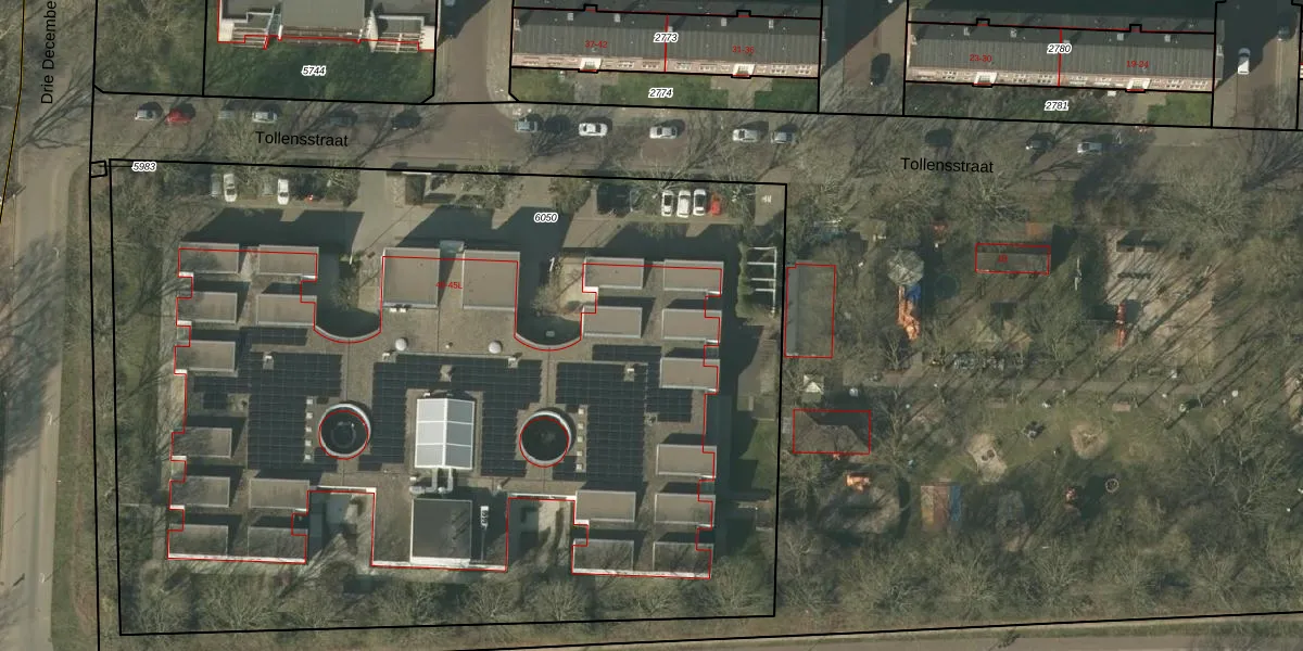 Het perceel waarop Tollensstraat 45-A staat heeft een oppervlakte van 7114 m². Dit is een zeer groot perceel. De perceeloppervlakte wordt geregistreerd door het Kadaster. Gedetailleerde informatie over de maten van dit perceel kunt u vinden in het rapport Kadastrale kaart met maatvoering van Tollensstraat 45-A.