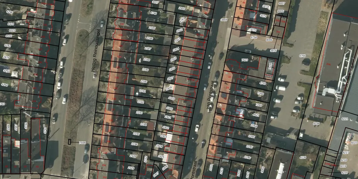Het perceel waarop van Pontstraat 19 staat heeft een oppervlakte van 107 m². Dit is een middelgroot perceel. De perceeloppervlakte wordt geregistreerd door het Kadaster. Gedetailleerde informatie over de maten van dit perceel kunt u vinden in het rapport Kadastrale kaart met maatvoering van van Pontstraat 19.