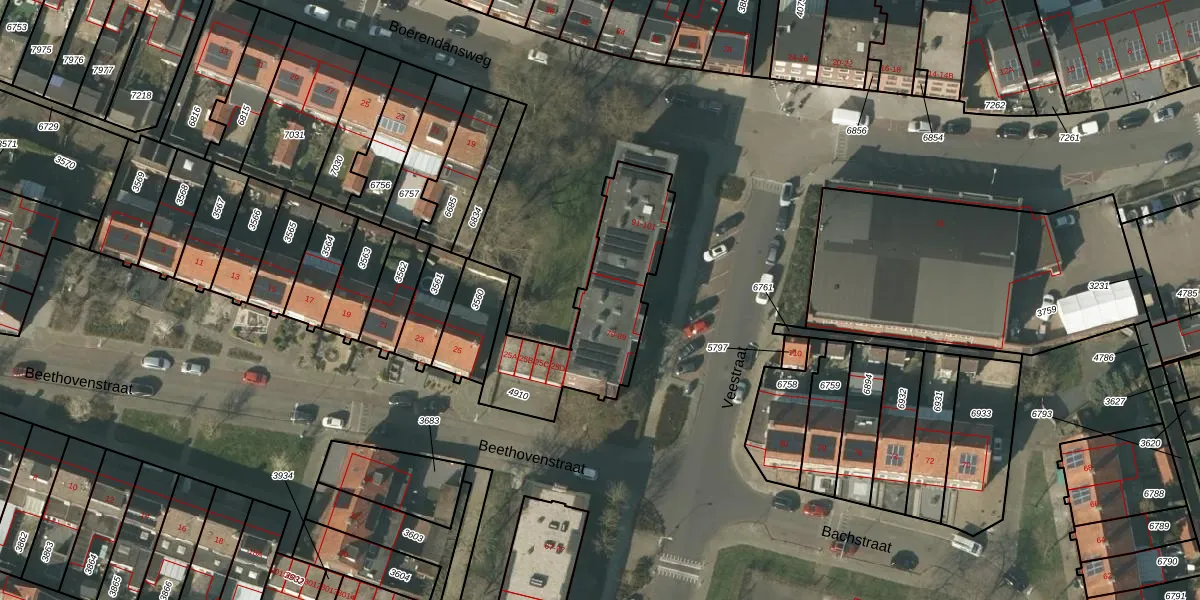 Het perceel waarop Veestraat 79 staat heeft een oppervlakte van 596 m². Dit is een groot perceel. De perceeloppervlakte wordt geregistreerd door het Kadaster. Gedetailleerde informatie over de maten van dit perceel kunt u vinden in het rapport Kadastrale kaart met maatvoering van Veestraat 79.