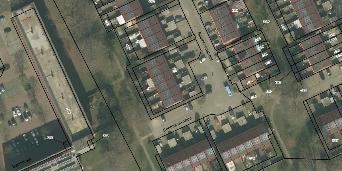 Het perceel waarop Beethovenstraat 26 staat heeft een oppervlakte van 1045 m². Dit is een zeer groot perceel. De perceeloppervlakte wordt geregistreerd door het Kadaster. Gedetailleerde informatie over de maten van dit perceel kunt u vinden in het rapport Kadastrale kaart met maatvoering van Beethovenstraat 26.