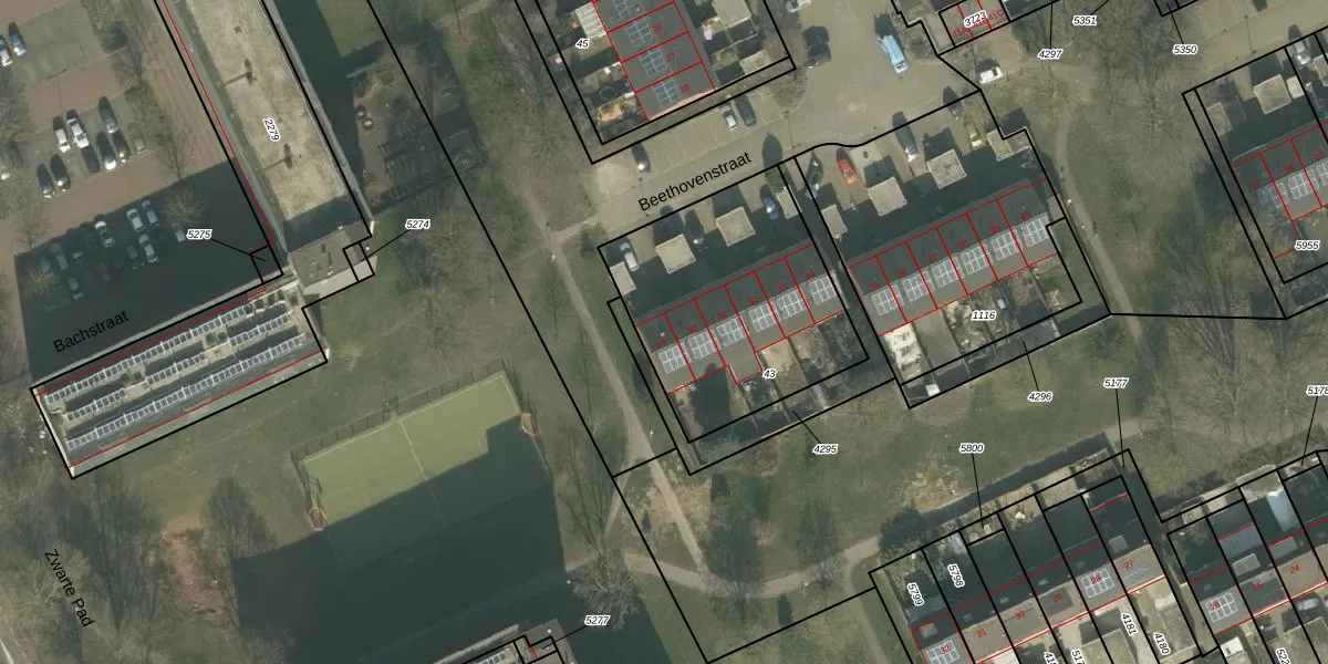 Het perceel waarop Beethovenstraat 29 staat heeft een oppervlakte van 965 m². Dit is een groot perceel. De perceeloppervlakte wordt geregistreerd door het Kadaster. Gedetailleerde informatie over de maten van dit perceel kunt u vinden in het rapport Kadastrale kaart met maatvoering van Beethovenstraat 29.