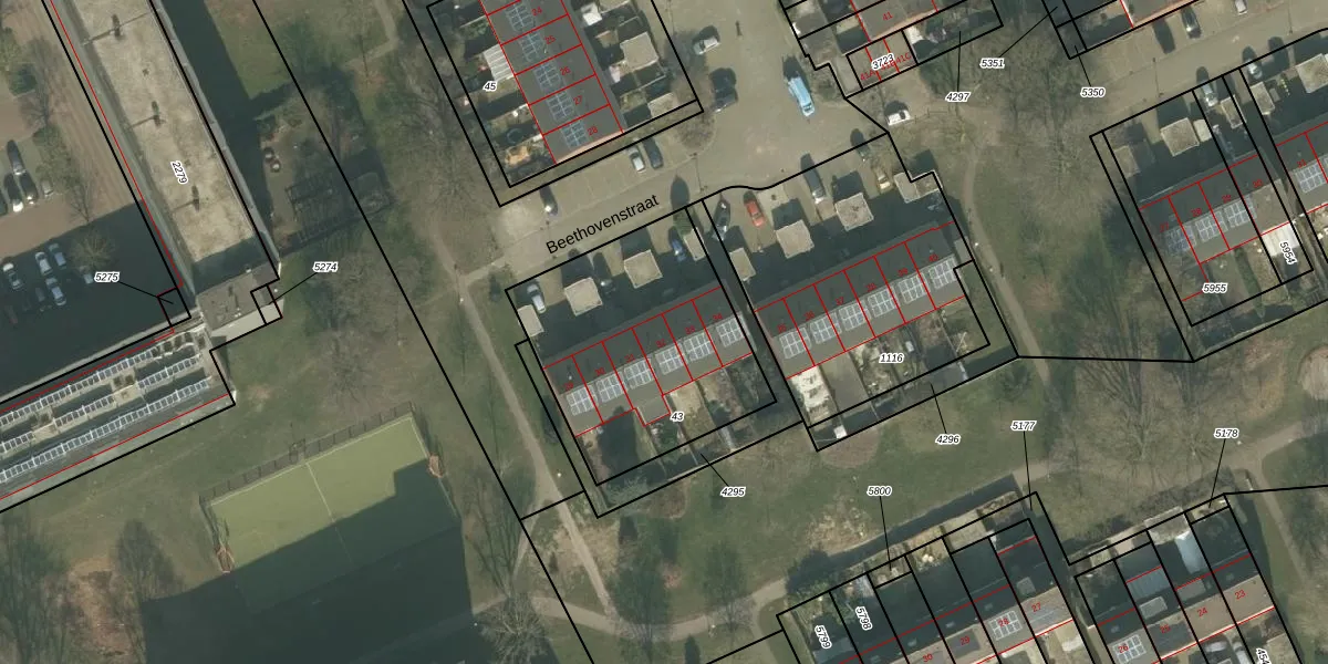 Het perceel waarop Beethovenstraat 32 staat heeft een oppervlakte van 965 m². Dit is een groot perceel. De perceeloppervlakte wordt geregistreerd door het Kadaster. Gedetailleerde informatie over de maten van dit perceel kunt u vinden in het rapport Kadastrale kaart met maatvoering van Beethovenstraat 32.